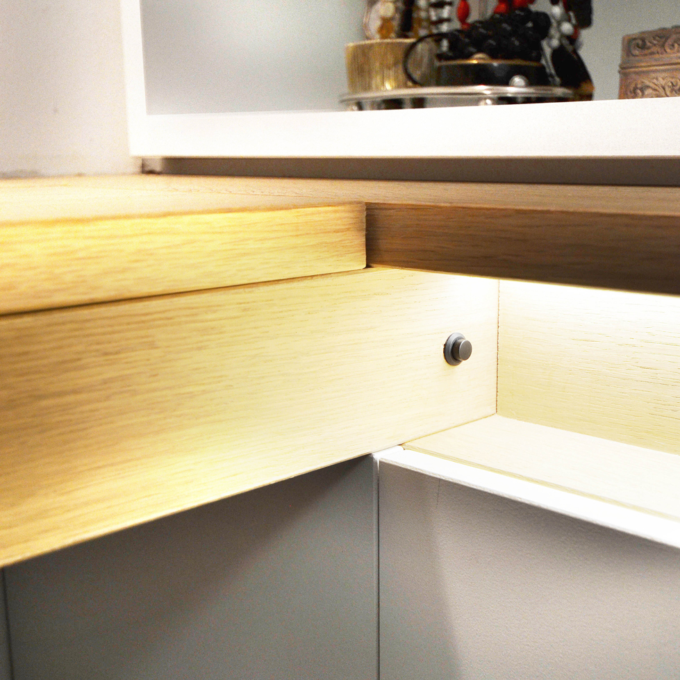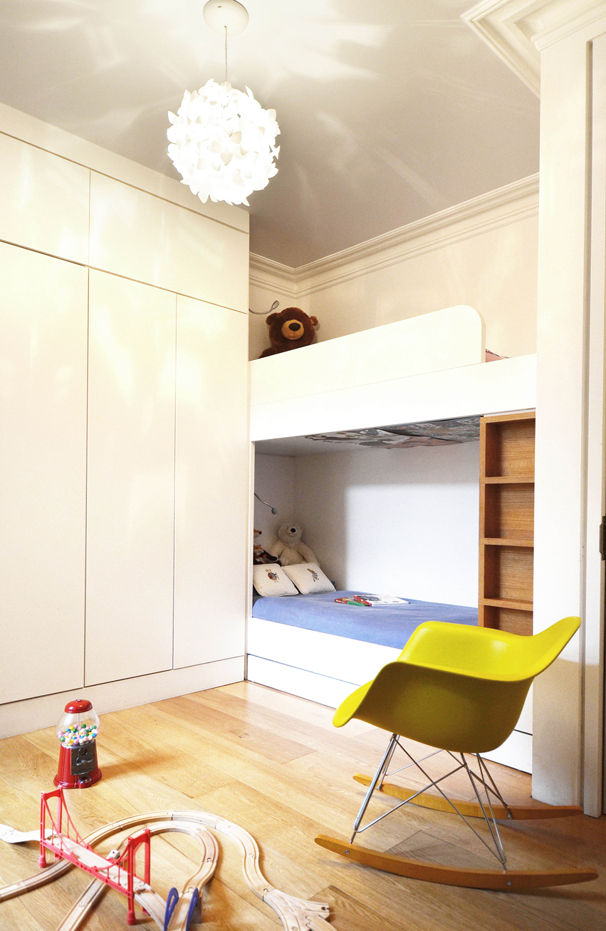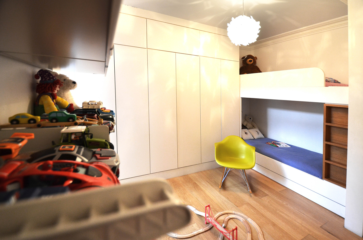 The flat, purchased by a young four-member family, had to be converted from a one-bedroom to a two-bedroom house. The project was conceived to allow the work to happen gradually, without preventing the owners from enjoying the house in the meanwhile. The first stage of the project envisaged straightening and rationalising the entrance hall, thus simplifying the circulation. Concurrently the second bedroom has been accommodated in place of the sitting room. The latter has merged into the kitchen thus creating a unique space overlooking the back garden. In a second phase, a rear extension will potentially be built, in order to enlarge the indoor living space.